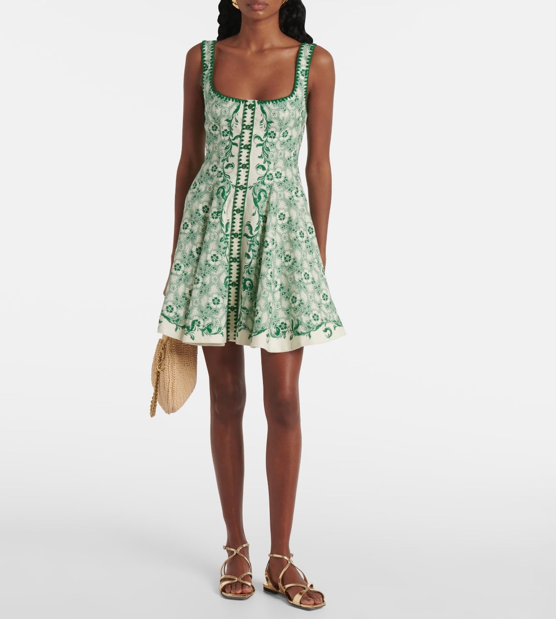This Alemais mini dress features a fresh grass green shade with a charming floral print, perfect for warm days. Crafted from breathable cotton linen, it offers comfort and style effortlessly. The sleeveless design and rear zip ensure a flattering fit, while front buttons add a delicate touch. Ideal for casual outings or garden parties, this dress combines ease and elegance in one.